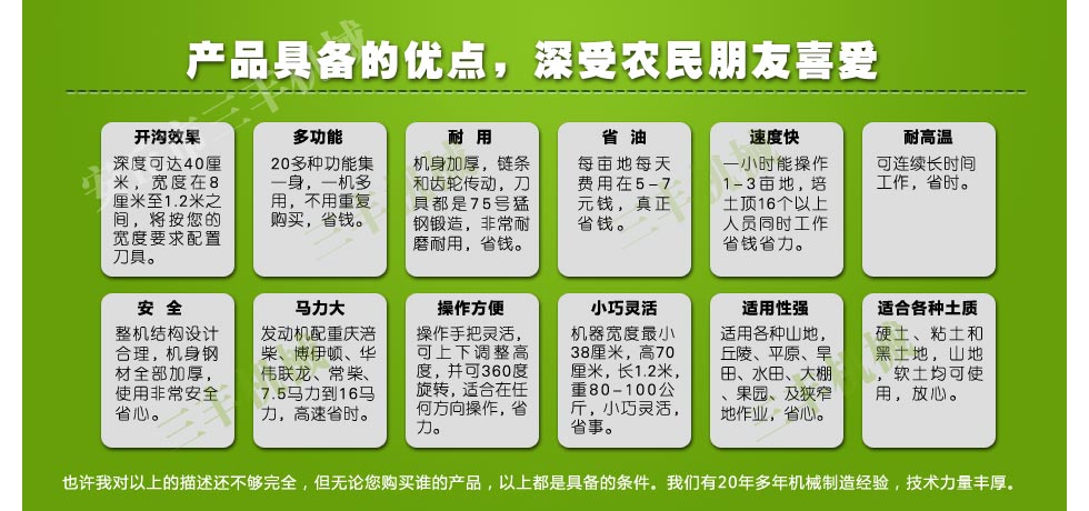 公司生產(chǎn)的微耕機(jī)品質(zhì)好、質(zhì)量用,機(jī)身一次沖壓成型;擁有一臺(tái)機(jī)器即等于免費(fèi)擁有了10名工人